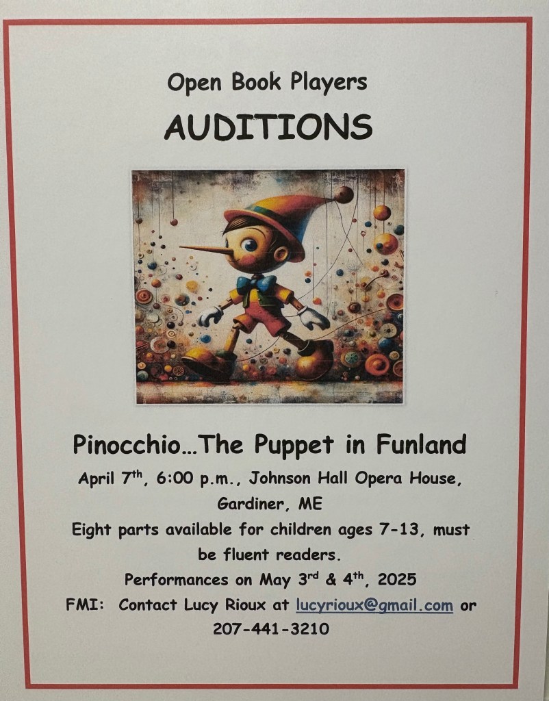 The last production of our 2024-2025 season is “Pinocchio…The Puppet in Funland” which will be performed by young actors, ages 7-13. Auditions will be held on April 7th at 6:00 p.m. at Johnson Hall Opera House in Gardiner. There are 8 parts available and those auditioning must be fluent readers. Hope to see many of you there!