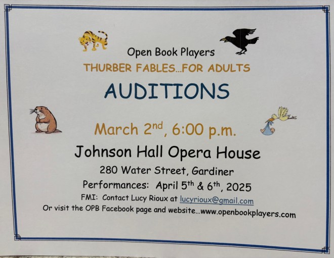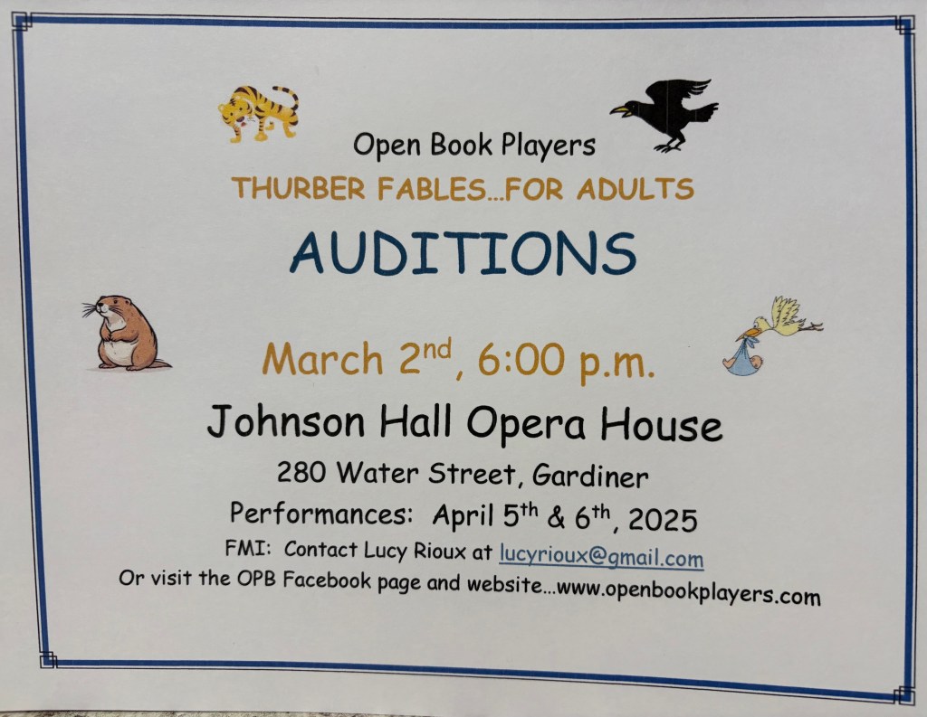 COMING UP…Auditions for “Thurber Fables…For Adults” on March 2nd, 6:00 p.m. at Johnson Hall Opera House. Parts available for 5 to 10 actors, ages 16 to senior adult! Performances are on April 5th at 7:30 p.m. and April 6th at 1:00 p.m. Come join us for a fun-filled production of these witty and timeless Thurber short stories scripted for readers theatre!